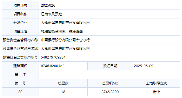 位于太仓城厢镇板块的江南禾风云庭取得预售许可证。此次预售楼栋为20号楼,共计新增建筑面积8746.82㎡,新增房源100套。